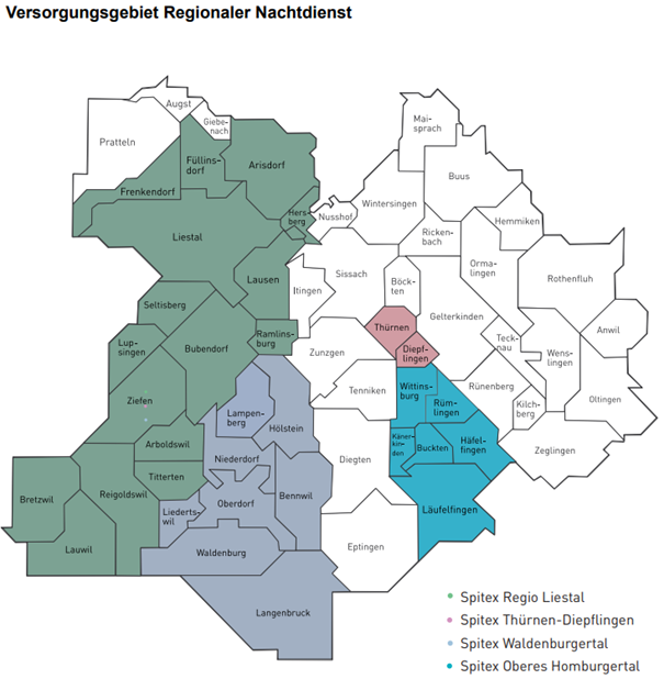 Der Regionale Nachtdienst ist ein gemeinsames Angebot der Spitex-Organisationen Waldenburgertal, Regio Liestal, Oberes Homburgertal und Thürnen – Diepflingen und steht Ihnen damit in 32 Baselbieter Gemeinden zur Verfügung. Die operative Leitung liegt bei der Spitex Regio Liestal.